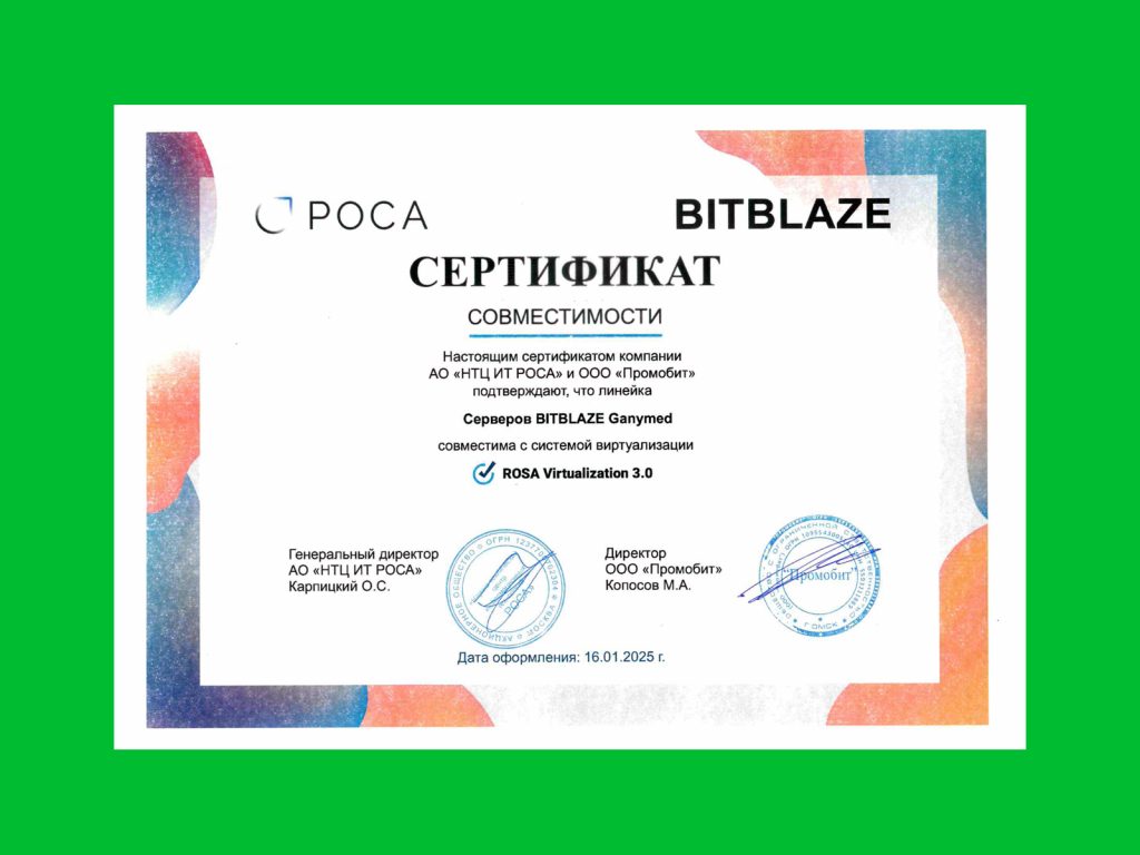 Компания «Промобит» и АО «НТЦ ИТ РОСА» сертифицировали совместимость линейки серверов BITBLAZE Ganymed с операционной системой РОСА «Хром» 12 Сервер. Также эти серверы сертифицированы в части совместимости с системой виртуализации ROSA Vitrualiztion 3.0. Соответствующие сертификаты подписаны руководителями предприятий в январе 2025 года.